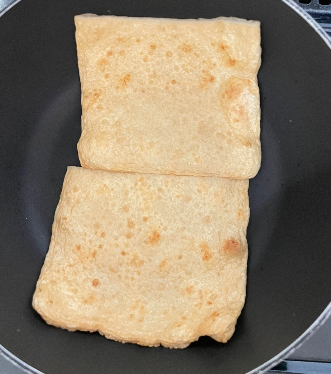 먼저 유부를 준비해 주세요 유부는 보통 유분이 많은데요 미리 사용할 만큼 꺼내 유부의 많은 기름기를 빼기 위해 뜨거운 물에 살짝 데쳐주세요 물기를 꼭 짠 후 팬을 달군후 가볍게 볶아줍니다 수분을 날리면서 쫄깃하게 만드는 과정입니다 노릇해졌다면 식힌 후 도마 위에 올려 잘게 다져주세요 유부는 주머니로만 쓰지 않고 속으로도 사용하는 과정입니다