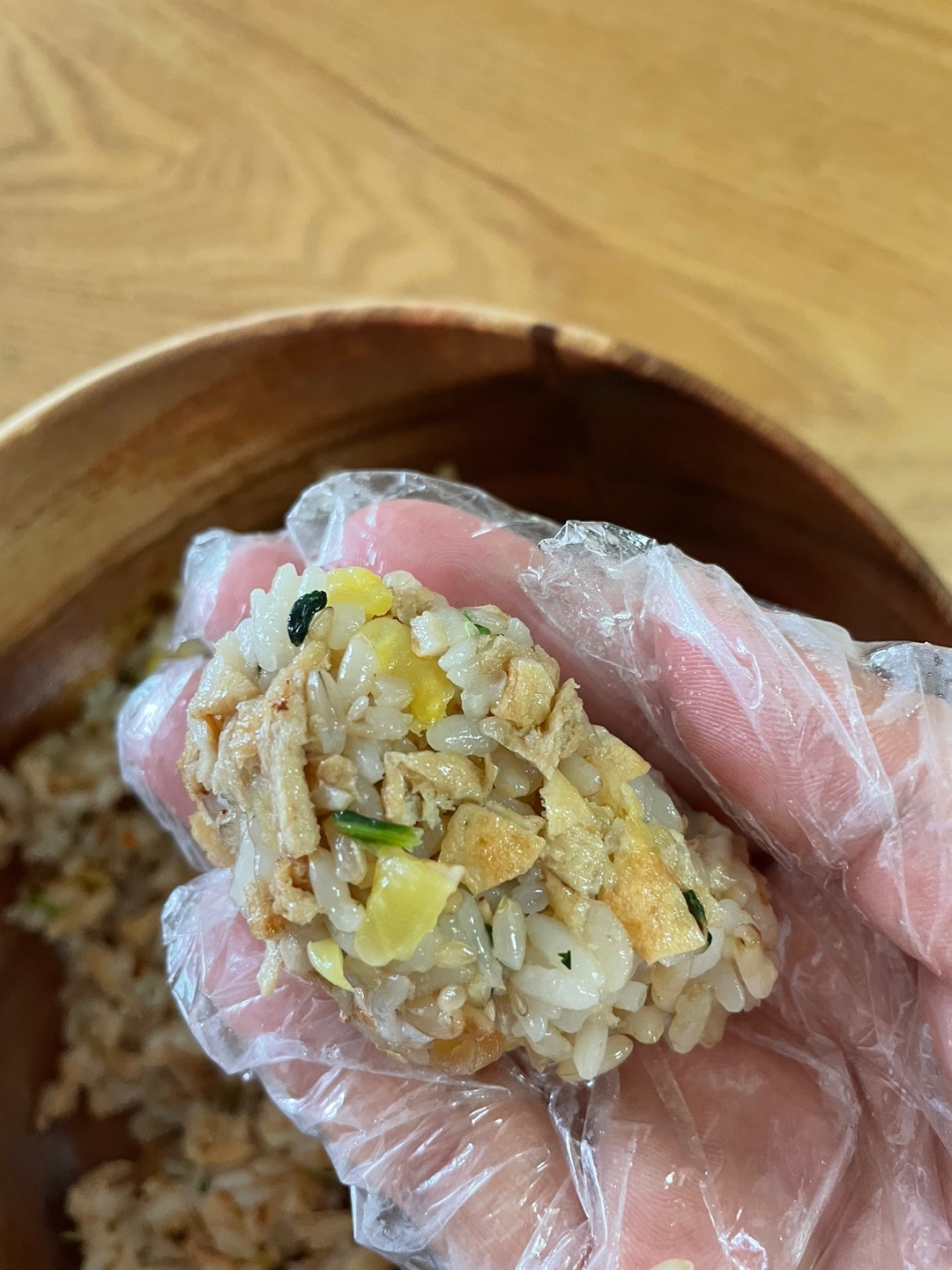이제 비닐장갑을 끼고 밥을 한입크기로 동글동글하게 만들어 주세요 너무 크게 만들면 유부 주머니에 넣기 어려우니 작게 만들어 부족하면 더 채워주는 방식으로 만들어 줍니다
