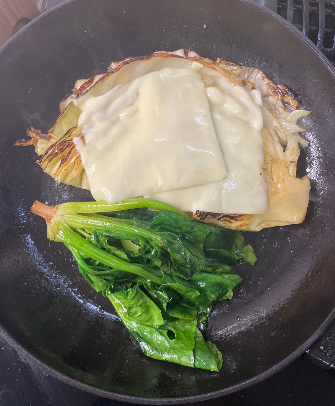 - 노릇하게 구워진 양배추 위에 모짜렐라 치즈를 듬뿍 올립니다.