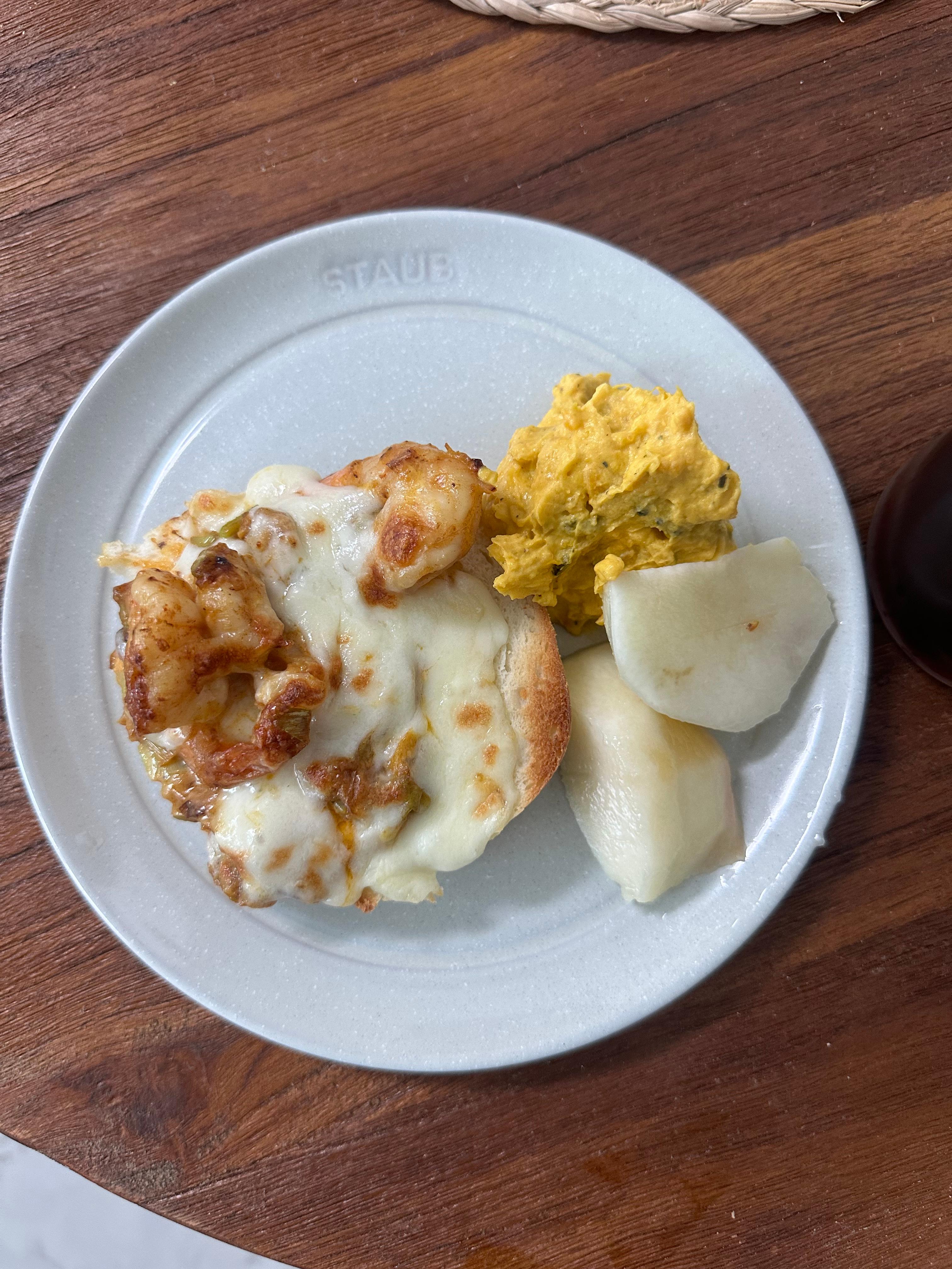 치즈범벅 새우를 올리고 파자치즈를 푸짐히 올렸다