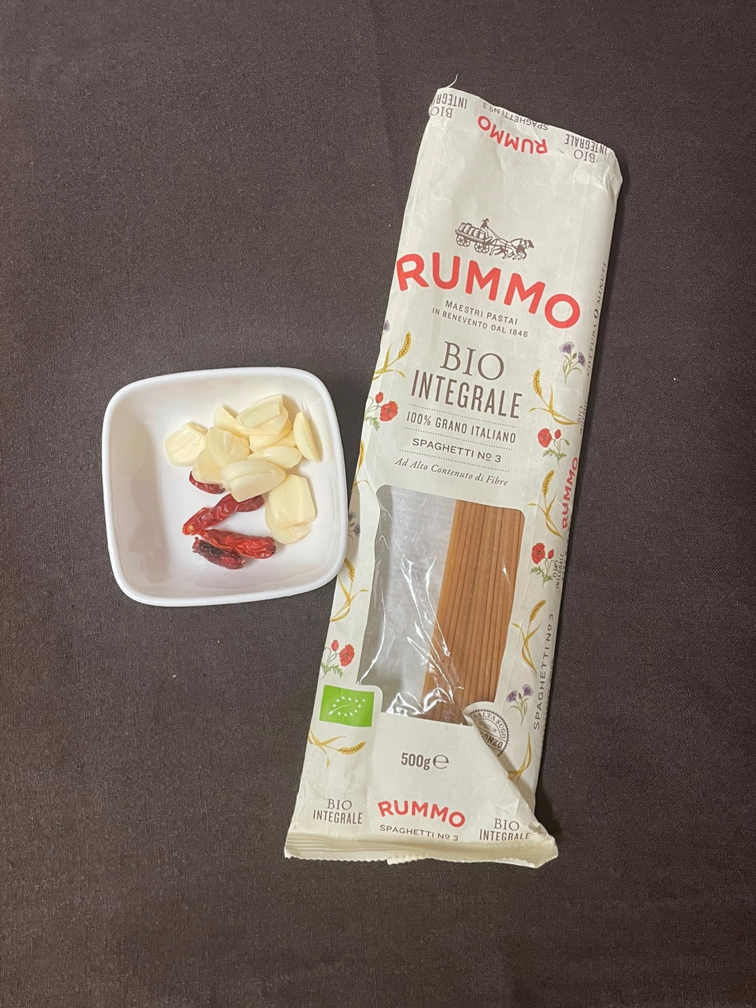 편으로 썬 마늘을 넣고 향을 낸 후 매콤한 것을 좋아한다면 지금부터 페퍼론치노를 넣으면 좋지만