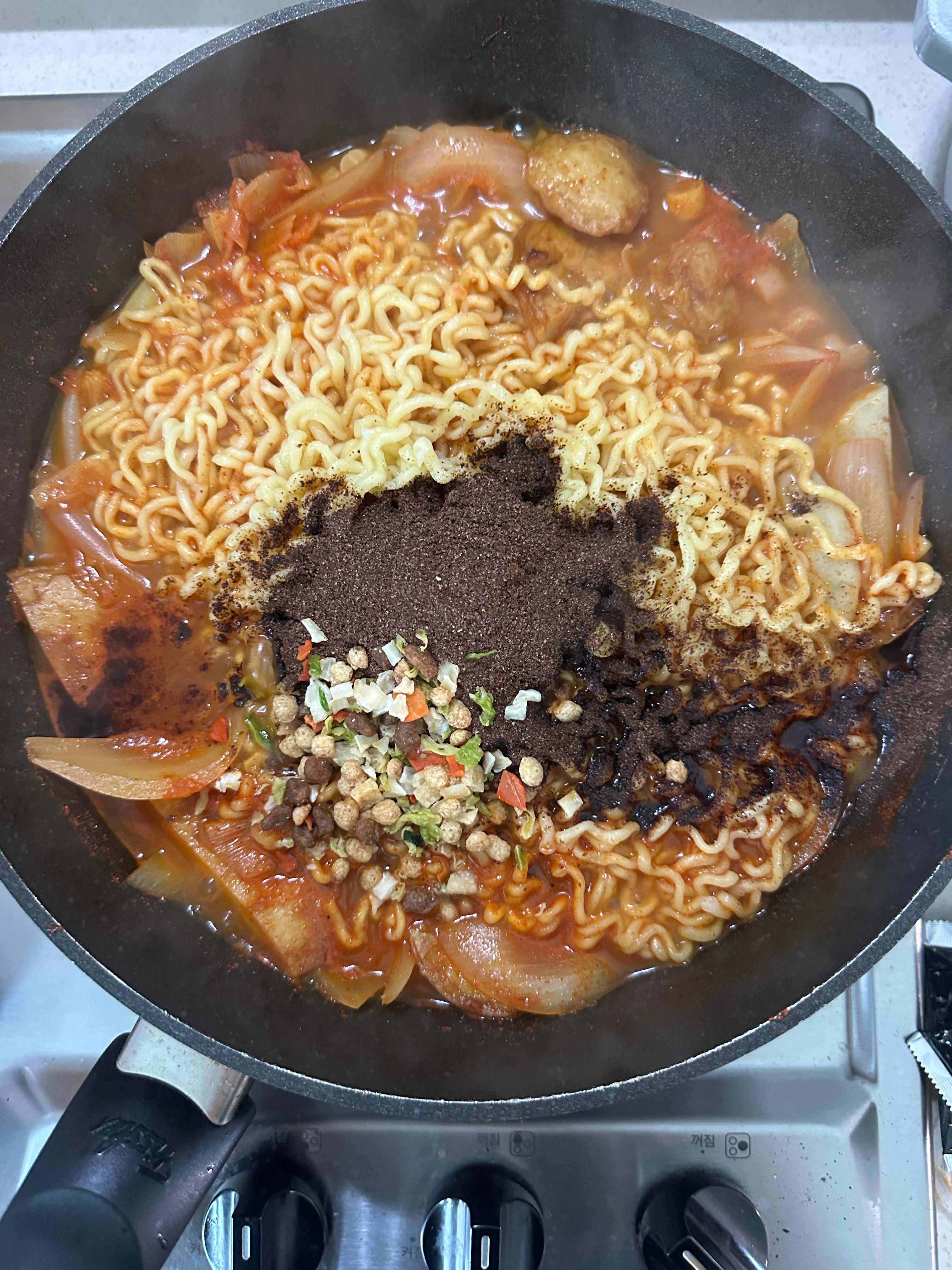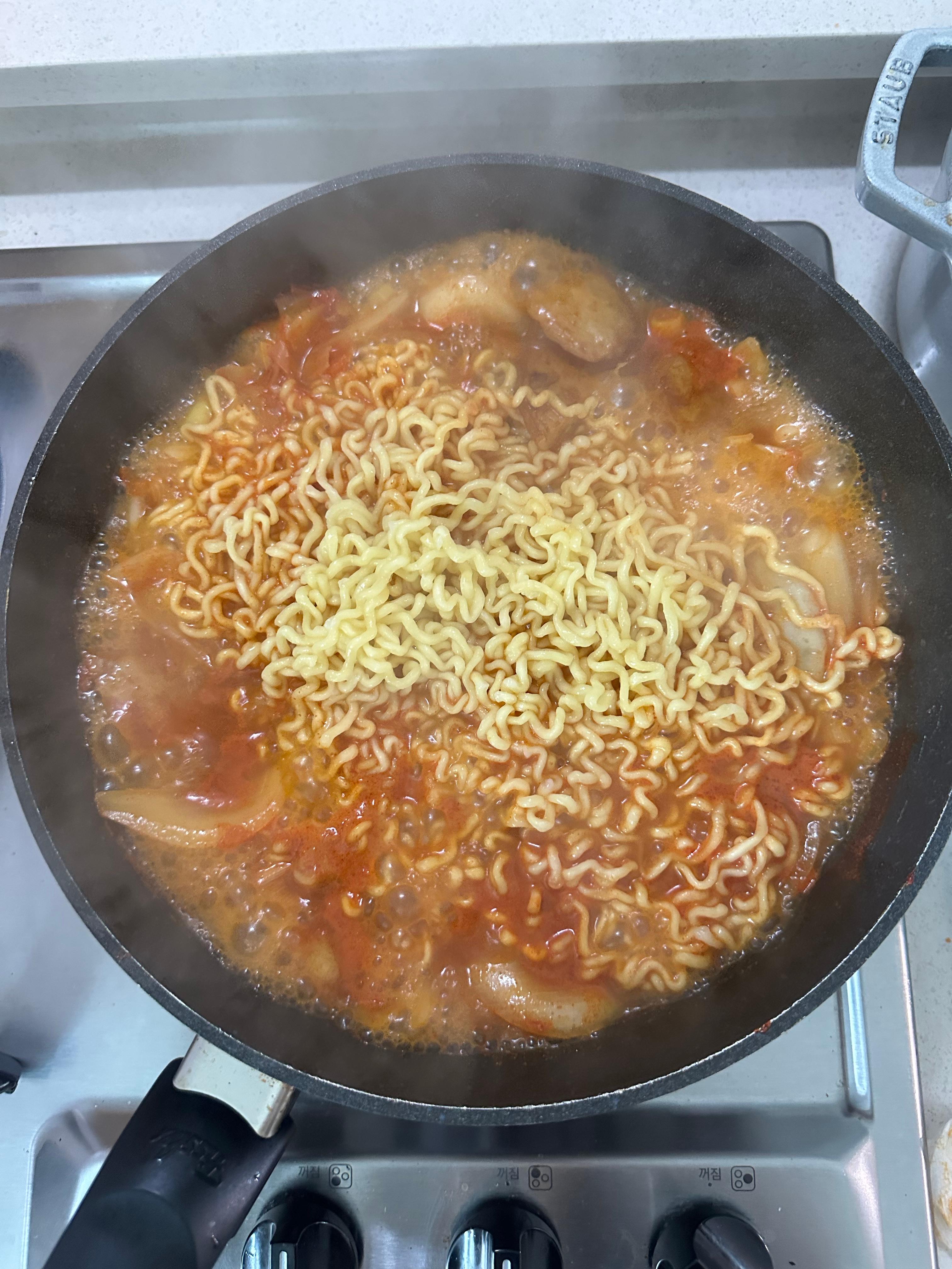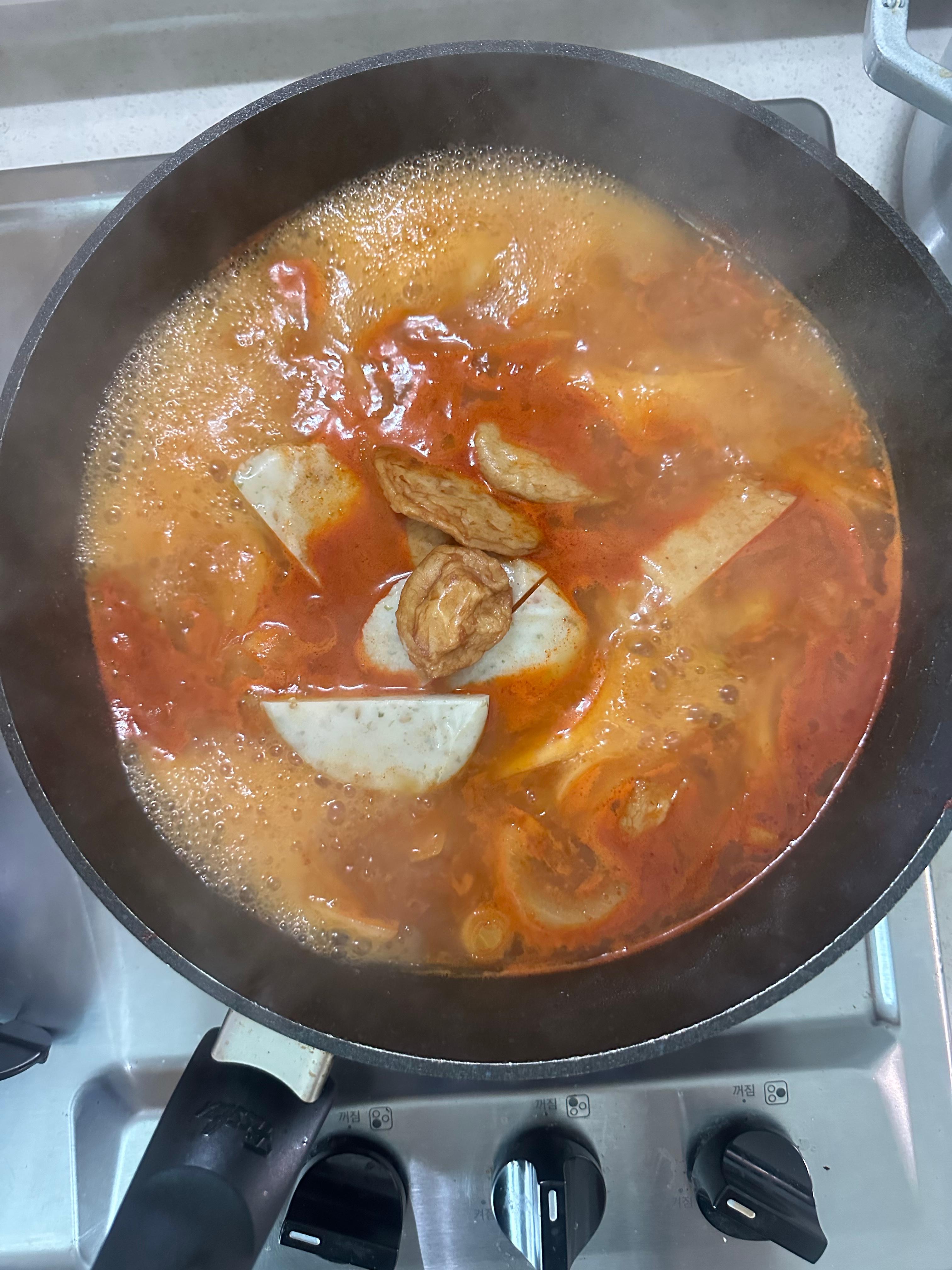 나머지 재료가 너무 익어버리고,,,, 국물이 너무 걸쭉해져서 그 뒤론 따로 면을 삶아서 넣는다물론 즉석떡볶이 버전이라면 재료를 몽땅 한번에 넣고 끓여가면 먹는 것도 또 하나의 먹는 방법
